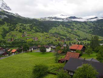 チューリヒから田園地帯を特急でベルン、乗り換えてインターラーケンへ。インターラーケン・オストから登山鉄道で山間をぬって登っていく。30分余りで1週間過ごす予定のグリンデルワルト駅(標高1034m)に到着。グリンデルワルト駅は中国人インド人コリアン、イスラムそして2割ほどの欧米人,国際色豊かだ。
