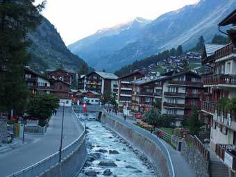 夕方になるとモンテ・ローザホテルの前では生演奏が始まってなかなかロマンチックな雰囲気。マッターフィスパ川まで少し歩く途中マッターホルンの絶景ポイントがある。河の水の色は白濁している。氷河の水を集めた川特有のミルク色。