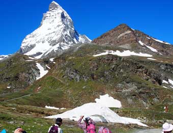 シュワルツ・ゼー(黒い湖)では逆さマッターホルンを見た。そこからフーリまでかなり急な下り坂を歩いた。4時間半も氷河の雪や小石がごろごろしている急こう配の難所をストックを頼りに神経をピリピリさせて歩いたのだが、陽気な柳川組と一緒だったので頑張れた。