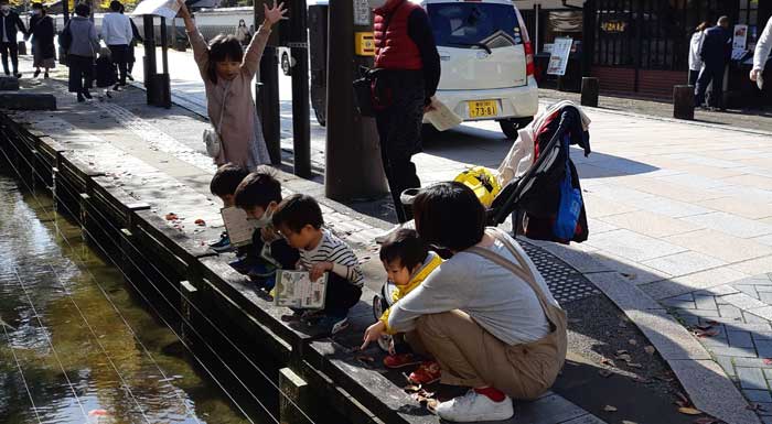 町の水路に泳ぐ大きな鯉に歓声を上げる孫たち。